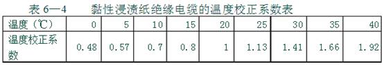 絕緣電阻隨溫度變化而小正,環(huán)境溫度,埋設好的電纜需要記錄土壤溫度。黏性浸漬紙絕緣電纜的溫度校正系數如表6—4所示。